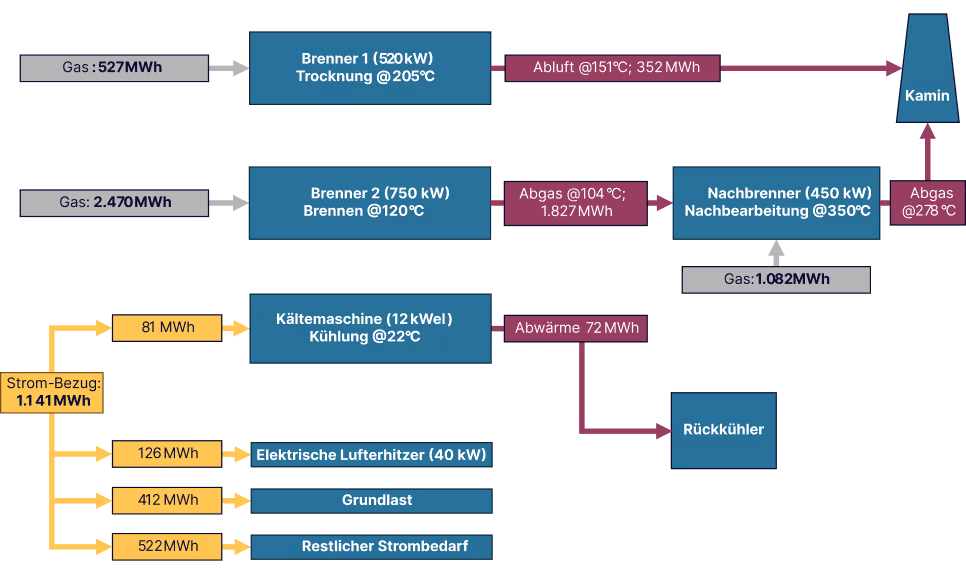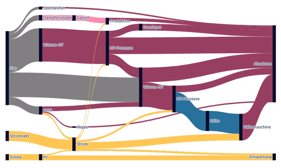 We visualise the energy flows in your company, identify energy-intensive processes and their temperature levels, and highlight where the greatest losses occur.