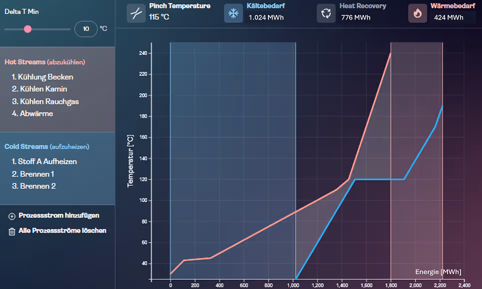 Wherever processes need to be heated or cooled, there is potential for heat integration. We quantify how much thermal energy can ideally be reused through heat exchangers, storage tanks and heat pumps.
